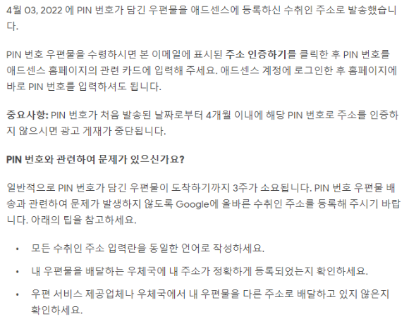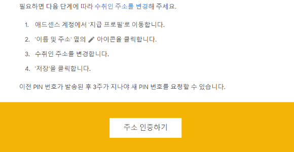 조치 필요: 애드센스에 등록된 수취인 주소를 인증해 주세요