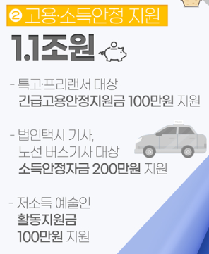 특수형태근로종사자(특고), 택시 기사, 예술인 등에 최대 200만원의 고용·소득 안정지원금을 지급함.