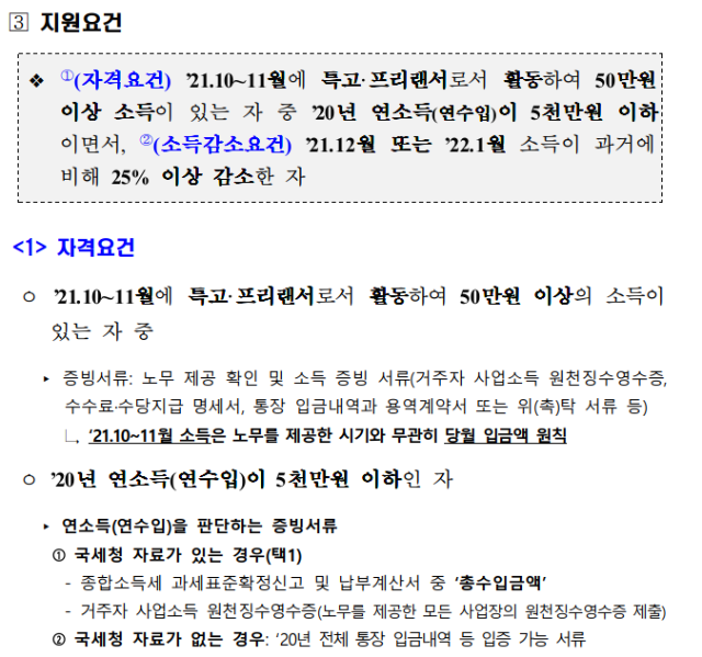 1. 21.10~11월에 특고 프리랜서로 활동하여 50만원 이상 소득이 있는 자.