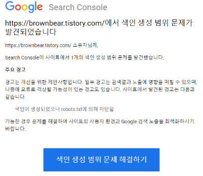 색인이 생성되었으나 robots.txt에 의해 차단됨 갑자기 메일로 이런 내용이 날라왔네요. 글 쓴것도 없는데 일요일에 무슨 날벼락인지 상당히 당황스러웠네요. 티스토리 개설하고 한달간 글쓰고 애드센스 승인받느라 한달 걸렸는데 뭐가 잘못된건가 했는데, 결론은 다들 큰 문제 없다고 하네요. 처름엔 뭣도 모르고 메일의 하단 파란색 '색인 생성 범위 문제 해결하기'를 무작정 눌렀어요. 구글 서치 콘솔로 연결 되더니 '색인이 생성되었으나 robots.txt에 의해 차단됨' 이 나타났구요. 맨 아래 제 블로그 페이지 https://brownbear.tistory.com/manger 는 4.1 일 날짜로 나타나고 맨 위 처음 감지된 날짜는 4.2일로 나타나고 유효성 검사는 제가 눌러서 그런가 4.3 일이고 뭔가 복잡..