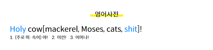 오늘 회사에서 젊은 친구들끼리 욕처럼 사용하길래 무슨 의미 인지 한번 찾아봤습니다. 영어로는 ' holy shit ' 라고 하더군요. 홀리 쉣 뜻 다음 사전에서 찾아보니 욕이라기 보다는 감탄사 정도의 의미이네요. 미드에서 종종 사용되는 말인가 봅니다. 미드를 자주 안보다 보니 쉣이 그냥 욕이려니 생각했었네요. 우리 표현으로 " 이런 젠장 " 정도의 의미로 생각하면 되겠네요.